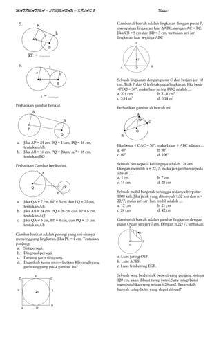 Dokumen tersebut berisi soal-soal tentang konsep-konsep matematika lingkaran seperti jari-jari, luas lingkaran, sudut, dan garis singgung lingkaran. Terdapat lebih dari 20 soal yang mencakup berbagai aspek matematika lingkaran untuk kelas 8.
