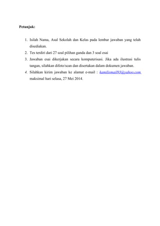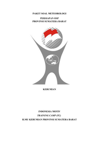 Dokumen tersebut berisi petunjuk soal ujian meteorologi untuk persiapan Olimpiade Sains Provinsi Sumatera Barat. Terdiri dari 27 pertanyaan pilihan ganda dan 3 pertanyaan esai yang mencakup konsep-konsep dasar meteorologi seperti tekanan udara, suhu, kelembaban, awan, front, dan angin. Peserta diinstruksikan untuk mengisi lembar jawaban dan mengirimkannya melalui email.