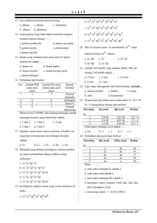 Teks tersebut berisi 35 pertanyaan pilihan ganda mengenai konsep-konsep kimia dasar seperti sifat-sifat senyawa kimia, reaksi kimia, asam-basa, dan koloid. Beberapa contoh pertanyaannya adalah tentang rumus senyawa kimia seperti K2CO3, orde reaksi dalam suatu eksperimen, dan fungsi karbon dalam proses pembuatan besi.