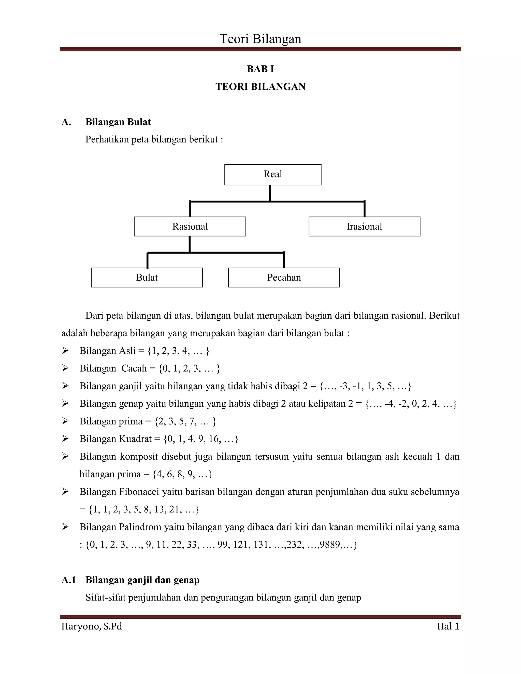 Dokumen ini membahas teori bilangan, yang meliputi jenis-jenis bilangan seperti bilangan bulat, rasional, irasional, dan bilangan prima, serta sifat-sifatnya. Selain itu, dokumen ini juga membahas barisan aritmetika dan geometri, keterbagian, serta banyaknya faktor positif dari suatu bilangan. Berbagai contoh dan solusi matematis disertakan untuk memperjelas konsep yang diajarkan.