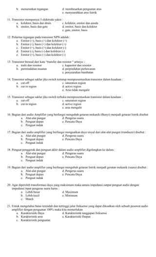 Dokumen ini terdiri dari soal ulangan umum semester pada mata pelajaran teknik elektronika dan radio. Soal-soal mencakup konsep-konsep dasar mengenai transformator, dioda, transistor, dan penguat audio serta frekuensi radio. Format soal adalah pilihan ganda dengan instruksi untuk memberikan jawaban yang paling tepat.
