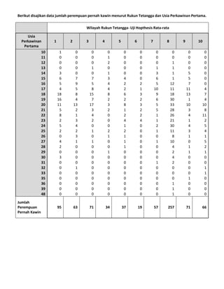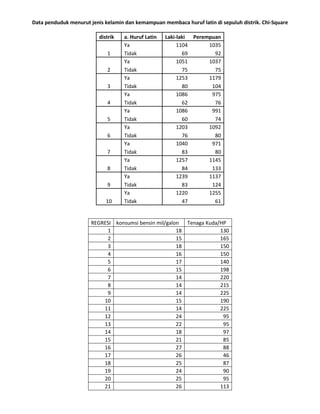 Dokumen tersebut berisi data jumlah perempuan menurut usia perkawinan pertama di 10 rukun tetangga dan instruksi soal untuk menganalisis data tersebut menggunakan biostatistik, termasuk menghitung rata-rata, standar deviasi, uji hipotesis dan chi-square, serta meregresikan konsumsi bensin terhadap tenaga kuda mesin mobil.