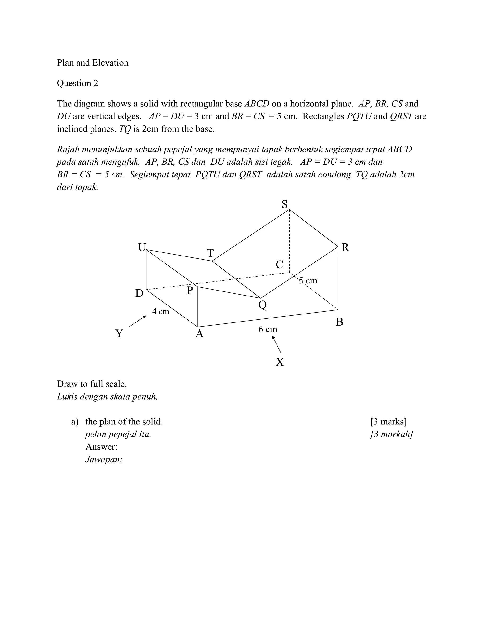 Dokumen ini menjelaskan tentang pemodelan tiga dimensi sebuah objek pepejal dengan tapak berbentuk segiempat tepat dan sisi tegak. Terdapat arahan untuk melukis pelan dan pantulan objek dari dua sudut pandang berbeza. Soalan ini mengandungi tiga bahagian yang memerlukan lukisan dalam skala penuh untuk mendapatkan pelan dan elevasi objek tersebut.