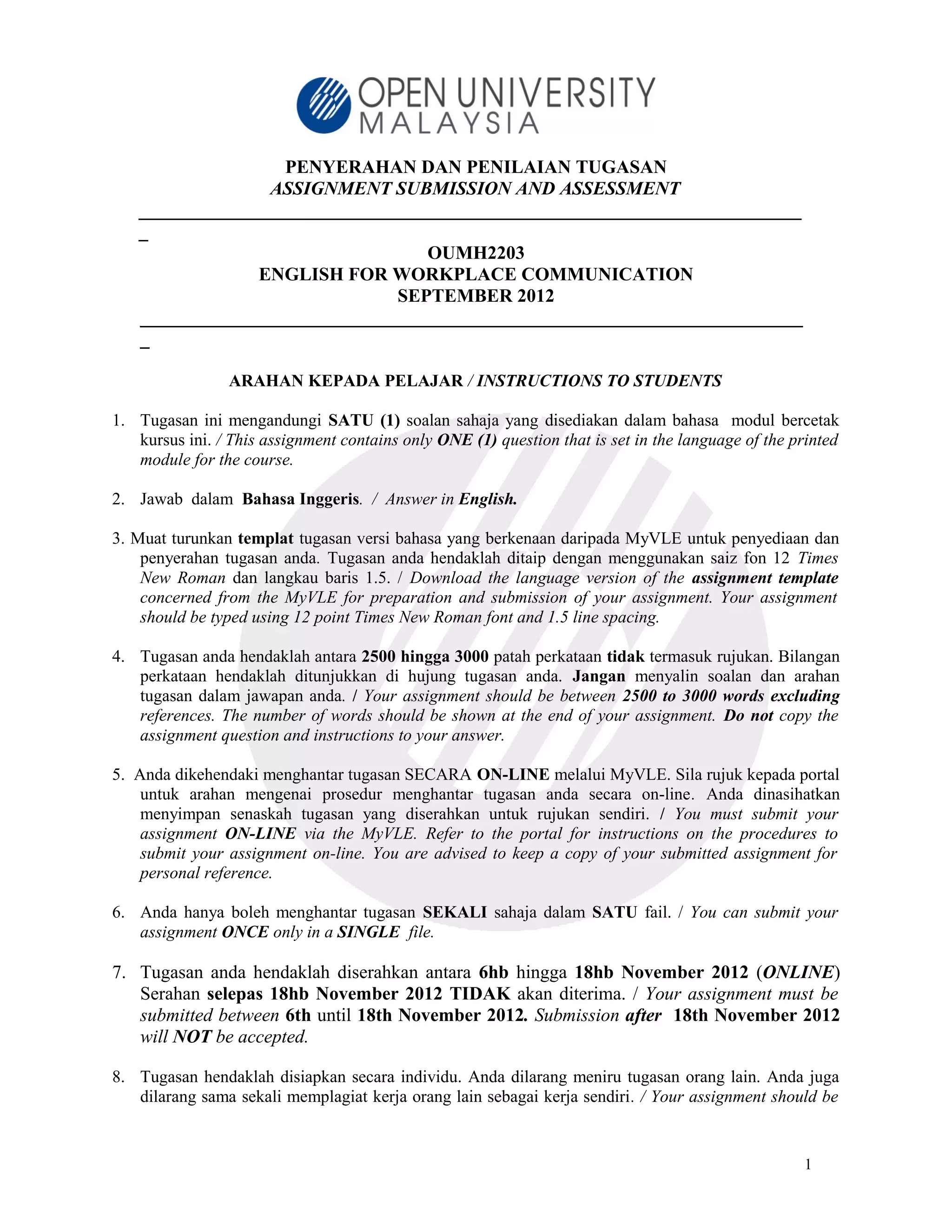 The document provides instructions for students on submitting an assignment for their English for Workplace Communication course. It outlines that the assignment contains one question to be answered in English between 2500 to 3000 words. Students must submit their assignments online between November 6th and 18th, 2012 via the MyVLE portal. Assignments are to be individually prepared and plagiarism is strictly prohibited. The assignment question asks students to write a report as an Occupational Health Manager to the Managing Director on safety issues observed in the Material and Handling department of the factory and provide recommendations to improve safety standards.