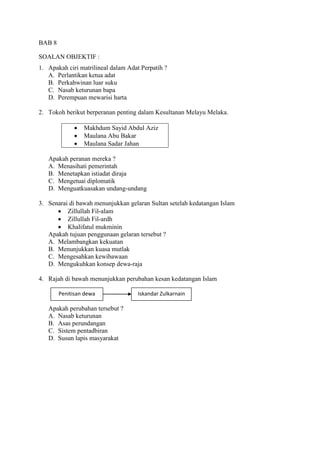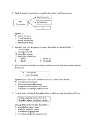 Dokumen ini mengandungi soalan objektif yang berkaitan dengan adat, sejarah, dan pengaruh Islam dalam masyarakat Melayu. Ia merangkumi pelbagai topik termasuk sistem pewarisan harta, peranan tokoh dalam kesultanan Melayu Melaka, dan aspek pendidikan tidak formal. Soalan-soalan tersebut bertujuan untuk menguji pemahaman tentang ciri-ciri budaya dan sistem perundangan Melayu sambil menekankan pengaruh Islam.