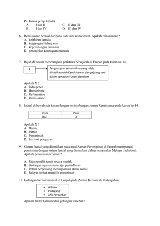Dokumen ini membincangkan sepuluh soalan objektif berkaitan sejarah, termasuk revolusi perindustrian di Britain, kejatuhan tamadun Rom, dan zaman gelap di Eropah. Ia turut merangkumi perjanjian Tordesillas antara Sepanyol dan Portugal, serta perkembangan zaman Renaissance. Soalan-soalan tersebut menguji pengetahuan tentang kesan penaklukan, ciri-ciri zaman, dan sistem feudal di Eropah.