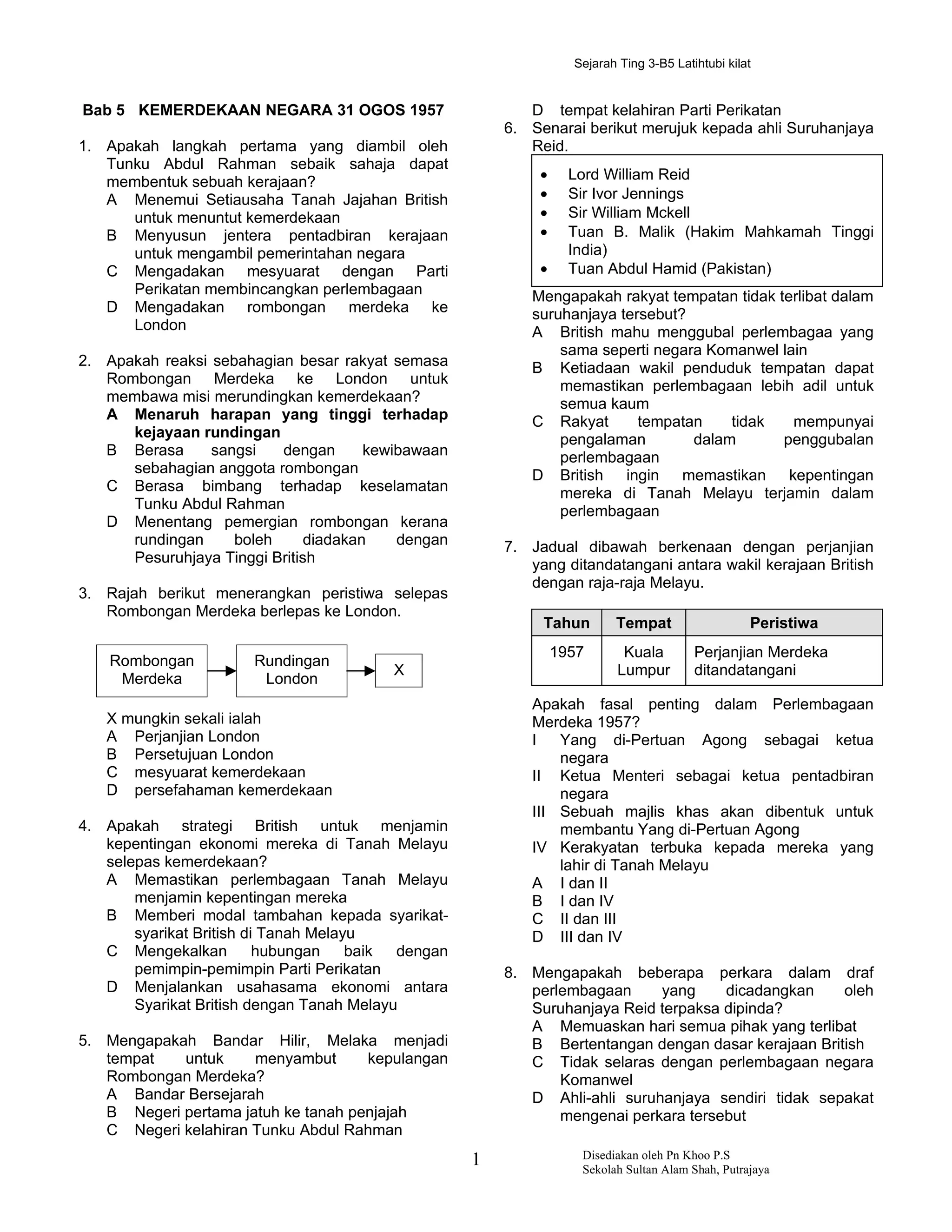 Dokumen ini membincangkan tentang sejarah kemerdekaan Malaysia yang dicapai pada 31 Ogos 1957, termasuk peranan pemimpin seperti Tunku Abdul Rahman dan isu berkaitan perlembagaan. Terdapat analisis mengenai reaksi rakyat terhadap rundingan kemerdekaan, perjanjian dengan British, serta aspek kerakyatan dalam perlembagaan. Selain itu, ia menyentuh mengenai nilai-nilai murni yang perlu diterapkan semasa sambutan kemerdekaan.