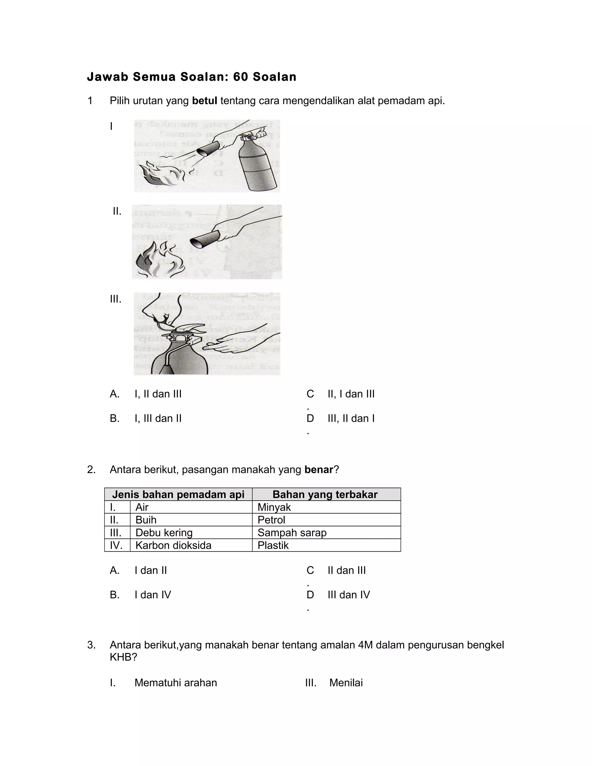 Dokumen ini mengandungi 60 soalan mengenai pengurusan alat, bahan, dan proses dalam konteks bengkel dan elektrik. Soalan-soalan meliputi cara mengendalikan alat pemadam api, jenis bahan pemadam, kegunaan alat elektrik, serta teknik penyambungan dalam proses mekanikal. Ia juga menyentuh aspek perniagaan dan pembayaran serta kepentingan pemahaman tentang sistem mekanikal dan elektromekanikal.
