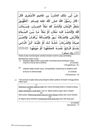 Dokumen ini adalah modul peningkatan prestasi akademik untuk penilaian menengah rendah 2013 di negeri Kedah. Ia mengandungi soalan-soalan berkaitan dengan ayat kursi dan hadis mengenai amalan-amalan baik dalam Islam. Selain itu, terdapat juga segmen yang melibatkan penulisan semula rangkai kata dalam tulisan jawi.