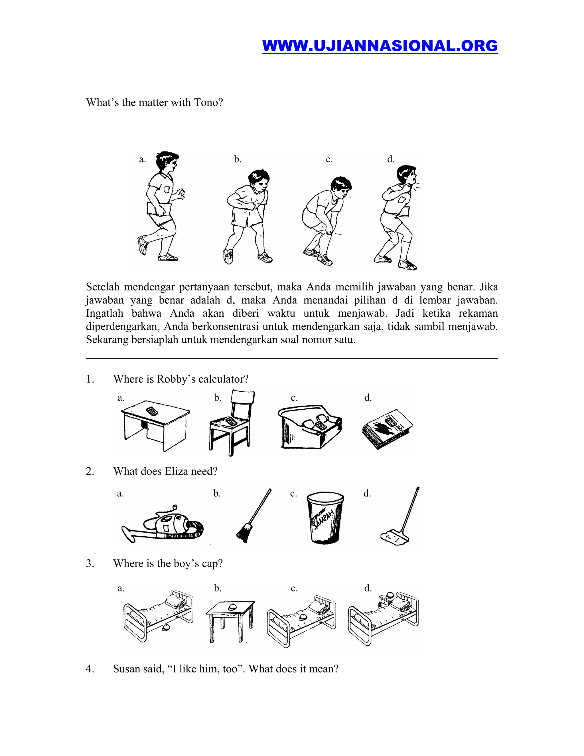 The document provides information and instructions about the 2011 Indonesian National Exam for junior high school students studying English. It outlines 9 general guidelines for the exam, including filling out the answer sheet, the time limit, number of questions, not allowing outside materials, and checking work before submitting. It then provides details about the structure and sections of the exam, including listening comprehension, reading comprehension, and sample questions.