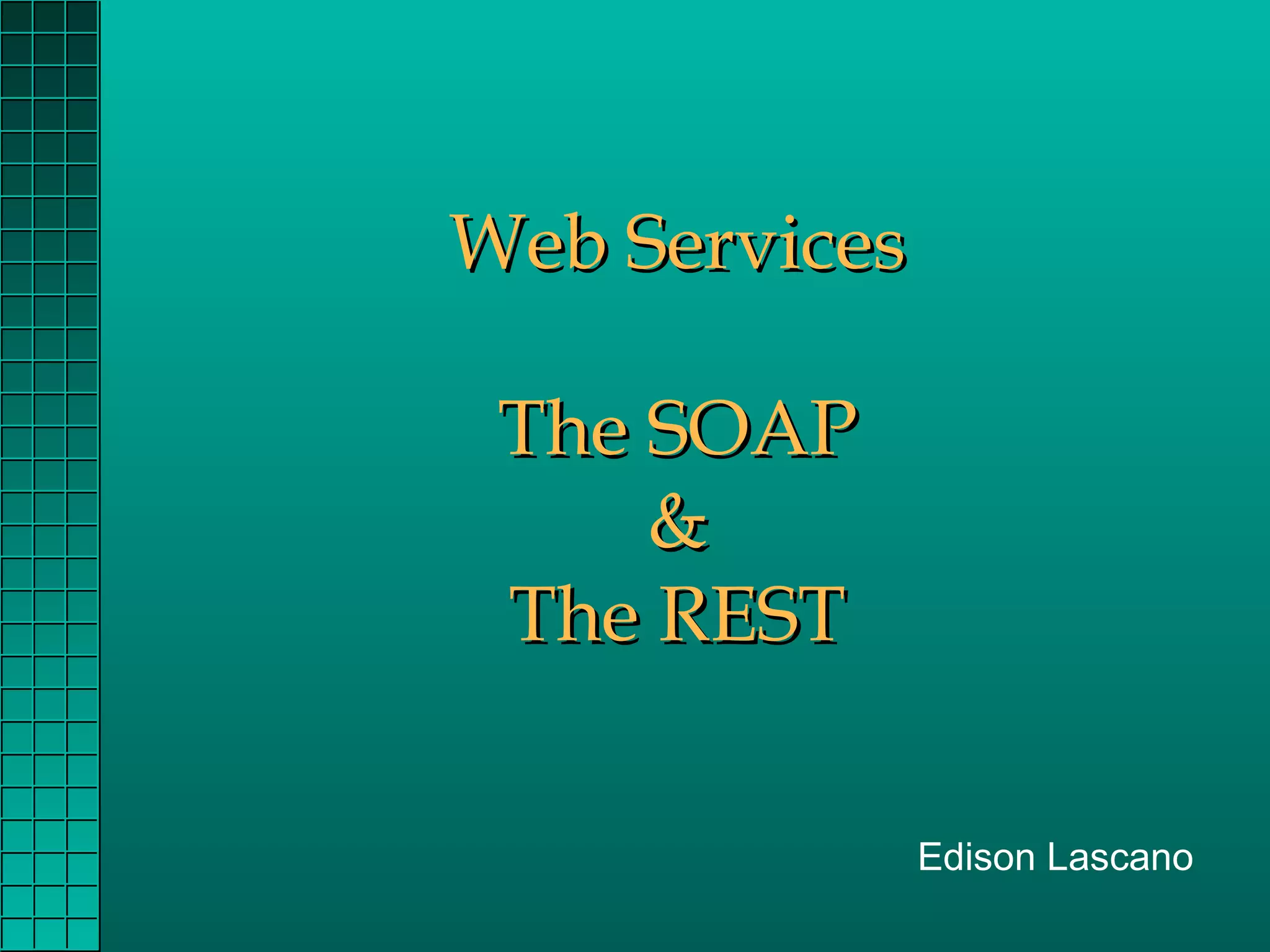 The document discusses web services and compares the SOAP and REST approaches. It provides details on: