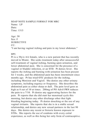 The document consists of two separate SOAP notes for two patients presenting with distinct health issues. The first patient, a 30-year-old female, reports symptoms of vaginal itching and lower abdominal pain, leading to a diagnosis of a urinary tract infection and candidiasis with a treatment plan including medication and education. The second patient, a 65-year-old male, presents with headaches and high blood pressure, diagnosed with essential hypertension and a management plan involving lifestyle changes and pharmacological treatment.