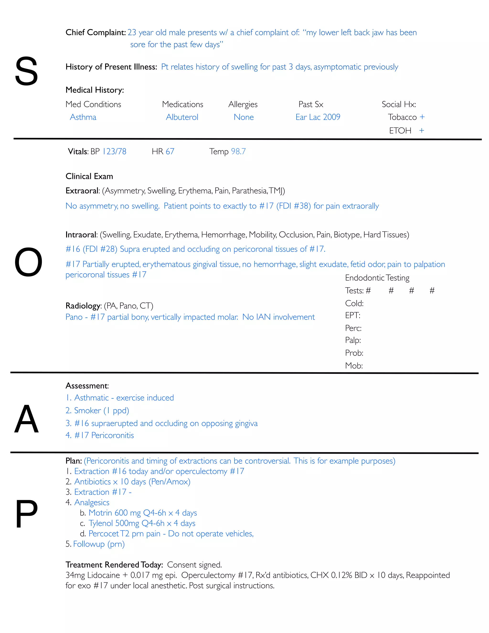 A 23-year-old male presented with a 3-day history of soreness in his lower left back jaw. Clinical examination revealed #16 was supraerupted and occluding on the gingiva of #17, which was partially erupted with erythema, exudate and pain on palpation. Radiographs showed #17 was partially bony impacted. The patient was diagnosed with pericoronitis of #17. The treatment plan included an operculectomy of #17, antibiotics for 10 days, and scheduling extraction of #17 under local anesthesia.