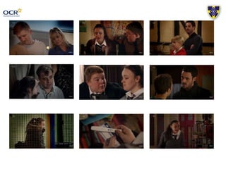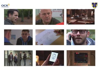 This document provides a textual analysis of two soap opera trailers. For trailer one, the analysis highlights the use of sad instrumental music, hostile dialogue between characters, and scenes showing bullying and flirting. Settings, costumes, and facial expressions further depict tension and depression. Trailer two features dialogue about reducing a prison sentence, sinister music, and heart monitor sounds building suspense. Angry facial expressions and a cunning look contrast prison and court settings. Both trailers utilize techniques like camera angles, cuts, and shots to portray power dynamics and build tension between characters. The document evaluates strengths of each trailer, noting areas that could be repeated or exploited in new soap opera trailers.