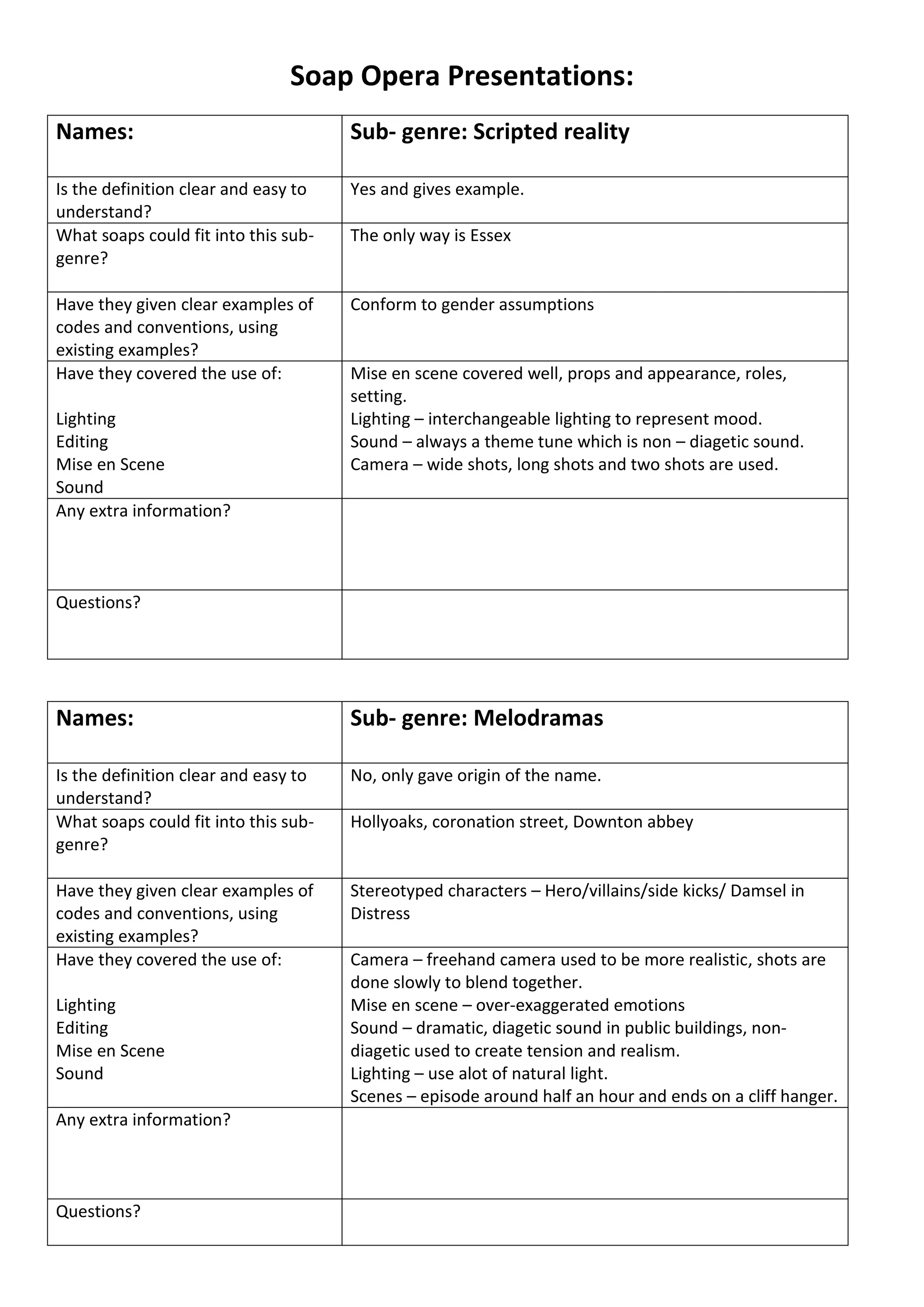 This document discusses several soap opera sub-genres: scripted reality shows, melodramas, telenovelas, American "fantasy" soaps, and Australian soaps. For each sub-genre, it provides examples of conventions like stereotyped characters, use of lighting, editing techniques, and sound. It also lists soaps that could fit into each category and asks if the definitions and examples of conventions are clear.