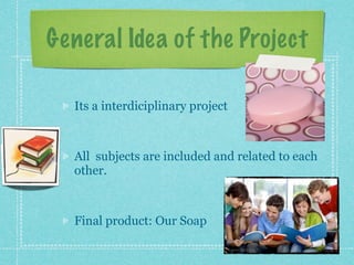 The document outlines an English soap project created by a group of students. The project involves developing a soap company called "Le Espume" that will produce soaps for personal hygiene. Key aspects of the project include creating a product called "Le Espume" soap described as providing a "soft touch" for skin care using milk protein and rose extract, developing marketing and branding materials like a poster and logo, and planning how and where to sell the soap like in supermarkets.