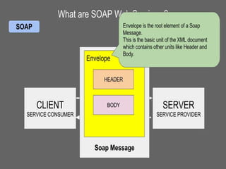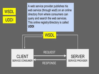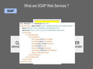 Web services allow applications to communicate over the World Wide Web. They convert applications into web-based applications that can publish functions for others to access globally. Common protocols for web services include SOAP, which uses XML messages over HTTP, and REST. WSDL describes web services by defining how they can be called, expected parameters, return data structures, and more. SOAP is a standard protocol that uses XML to exchange information for remote method calls over the internet in a platform-independent way.