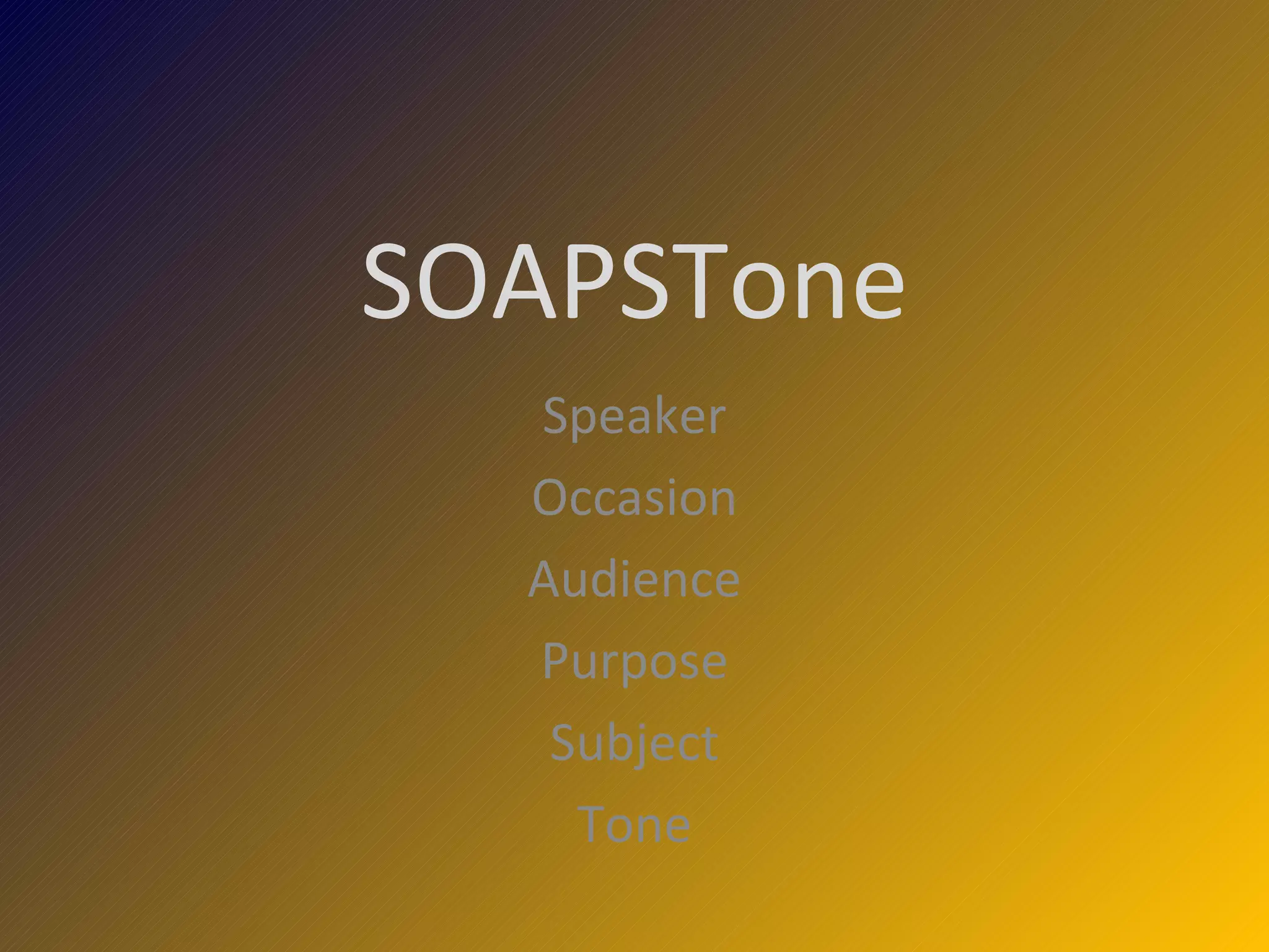 The document discusses the SOAPSTone framework for analyzing speeches and texts. It defines each element of SOAPSTone: Speaker, Occasion, Audience, Purpose, Subject, and Tone. It then focuses on Tone, explaining that tone is established through an author's use of figurative language, imagery, diction, details, and syntax.