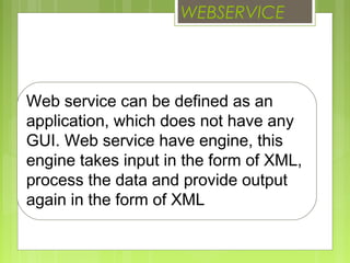 This document discusses web services testing using SOAPUI. It defines a web service as an application without a GUI that takes XML input, processes the data, and provides XML output. It describes how XML is used to define the format of data exchanged between systems, and how WSDL defines the format of input and output for a web service as well as the services it exposes. It identifies SOAP and REST as types of web services and discusses how SoapUI is used to generate XML requests, send them to web services, receive and validate the XML responses, and generate reports.