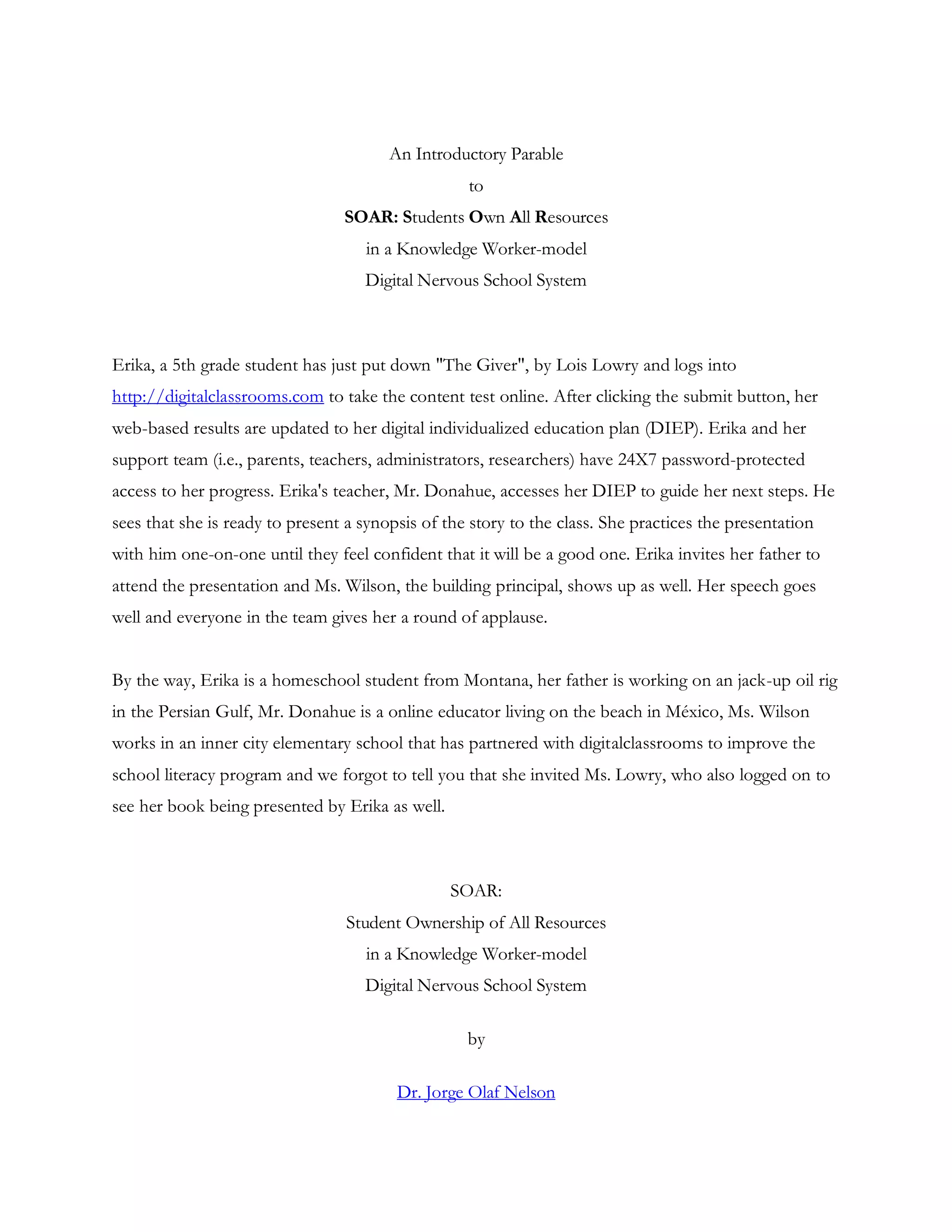 This document introduces the concept of SOAR (Students Own All Resources) learning in a proposed digital school system. The system would give students personalized access to curriculum through a Digital Individualized Education Plan (DIEP) tailored to their individual needs and interests. Students would access just-in-time instructional content as needed using a digital toolset, allowing them to learn at their own pace. The goal is to increase student engagement and achievement by giving them ownership over their education.