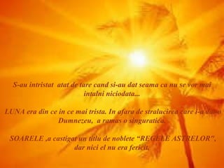 Soarele și luna s-au îndrăgostit, dar au fost obligați să trăiască separați, fiecare având rolul de a lumina ziua și noaptea. Deși fiecare are propria strălucire, luna se simte singură și tristă, iar soarele îi cere lui Dumnezeu ajutorul pentru a-i oferi companie stelele. În ciuda dorințelor lor, cei doi trăiesc așteptând rarele momente de eclipsă când pot fi împreună, simbolizând dragostea lor imposibilă.