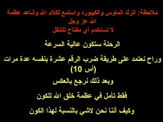 تتناول الوثيقة رحلة تأملية عبر الكون، تبدأ من الأرض إلى ما وراء حدود الظلام الكوني، وتستعرض مختلف المسافات والمظاهر الكونية. تتضمن رحلة العبور بين الكواكب والمجرات، وصولا إلى أصغر الوحدات الذرية، مما يبرز عظمة خلق الله. تختم الوثيقة بتساؤلات حول مكان الإنسان في الكون وإيمان المصمم الخالق.