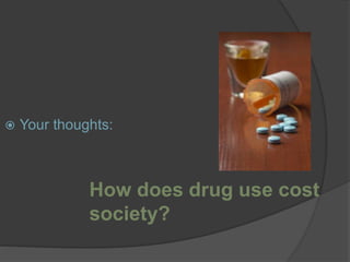 This document discusses how drug use impacts individuals and society. It notes that drug use can result in deaths, emergency room visits, lost productivity, broken homes, and higher medical costs. Surveys, reports, and questionnaires are used to track drug use trends over time. The document outlines various patterns of drug use and how perceptions of dependence have changed over time. It discusses how drug use can negatively impact families, social behavior, education attainment, employment, and fetal development. Testing methods and their limitations are also reviewed.