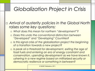 The document discusses the various crises facing the globalization project, including economic crises in developed nations resulting from austerity policies and debt; stalled progress on UN development goals; legitimacy crises for development agencies; political uprisings like the Arab Spring; shifts in global power to countries like China, India, and the BRICS nations; financial, food, ecological, and water crises; and obstacles to overcoming inequality and unsustainable growth. It concludes that while the globalization project is in transition rather than over, the sustainability project is emerging as crises expose issues with fossil fuel dependence and uneven development across nations.