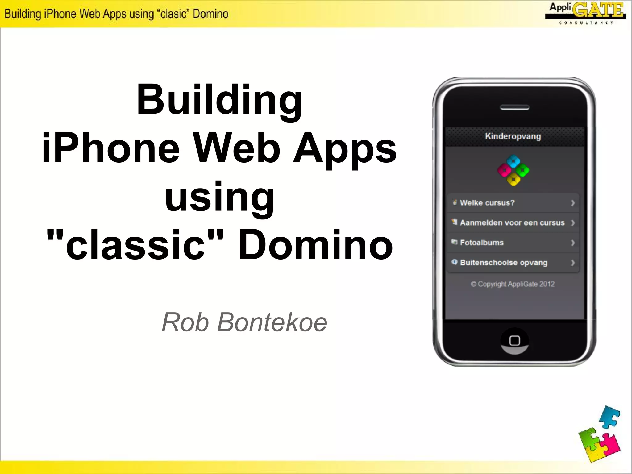 This document discusses building iPhone web apps using classic Domino. It covers the required structure of a mobile web app including initializing the app and registering event handlers. It demonstrates using embedded views in Domino to manage app pages and includes code examples for communicating with servers via AJAX. References are provided for JavaScript frameworks like jQTouch that can be used to build these types of apps.