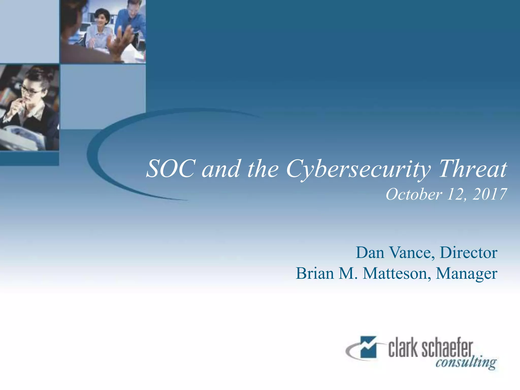 This document summarizes a presentation on SOC reporting and cybersecurity frameworks. It discusses the increasing need for cybersecurity frameworks due to rising data breaches and threats. It provides an overview of different SOC reports, including SOC 1, 2, and 3 reports, and introduces a new SOC for Cybersecurity report. This new report allows entities to demonstrate the effectiveness of controls in their cybersecurity risk management program. The presentation describes the components and structure of the SOC for Cybersecurity report, including describing the entity's cybersecurity risk management program and evaluating the effectiveness of controls. It recommends entities undertake a readiness review to identify gaps and determine next steps.