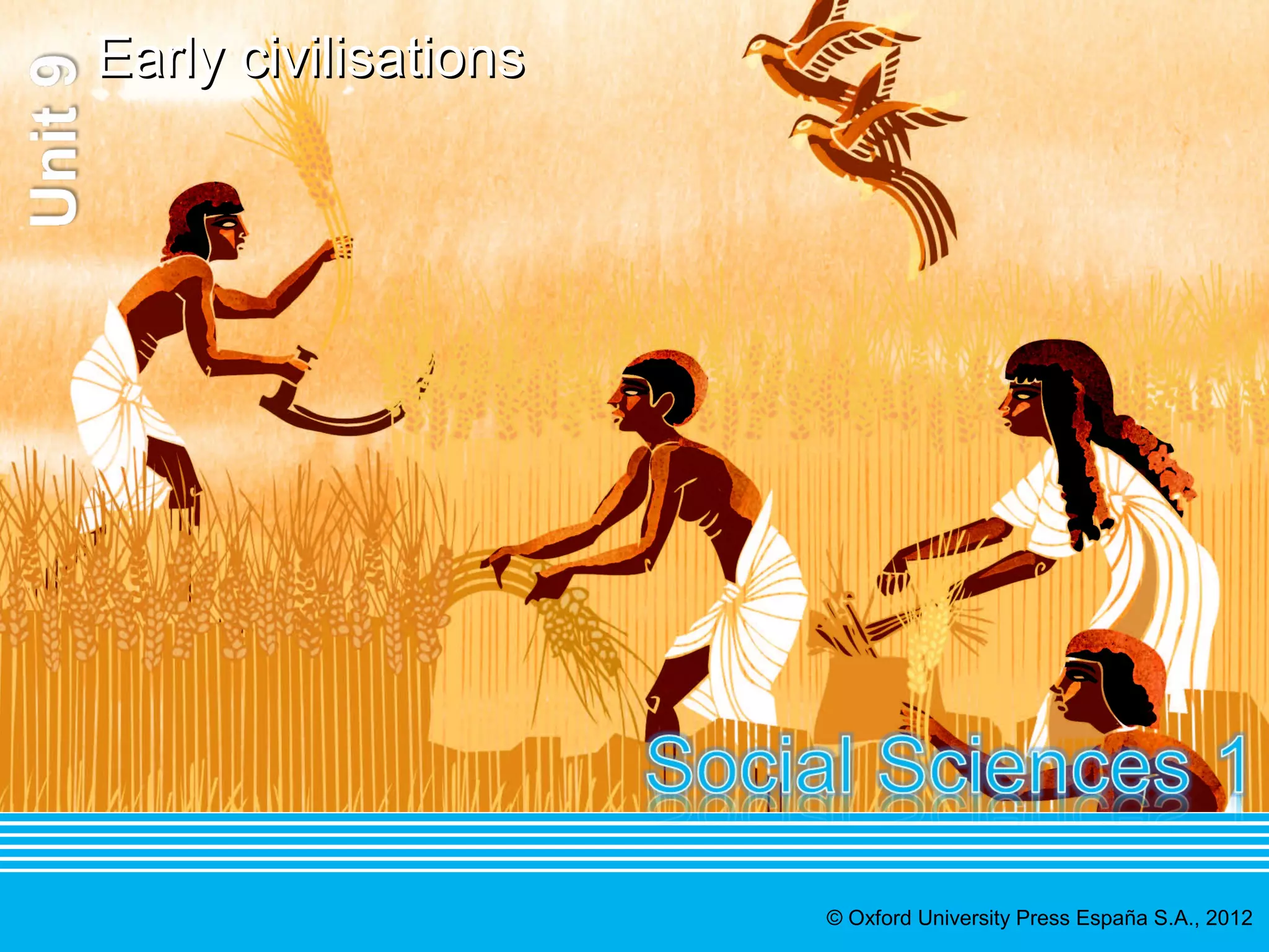 The document provides information about early civilizations, including Mesopotamia and Ancient Egypt. It discusses the emergence of cities and the first civilizations along the Tigris and Euphrates Rivers in Mesopotamia, which consisted of the regions of Assyria, Akkad, and Sumer. It also covers Ancient Egypt along the Nile River and its history from the Old Kingdom to the Late Period. The document describes the social hierarchies, religious beliefs, and architectural achievements of both Mesopotamian and Egyptian civilizations.