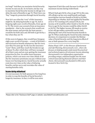 The document discusses using Social Security as a form of longevity insurance. It explains that by having the higher earning spouse delay collecting Social Security benefits until age 70, it can maximize the survivor benefit for the remaining spouse. This strategy provides the highest monthly income for the surviving spouse if one of them lives an extremely long life into their 90s or 100s. Even if the higher earner passes away earlier, say at age 70, the surviving spouse would still receive a larger monthly benefit from the delayed collection compared to claiming earlier at age 62. Viewing Social Security in this way helps protect against the risk of outliving one's savings.