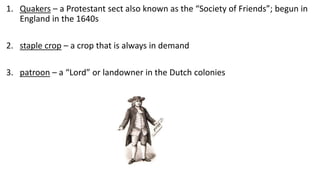 The Middle Colonies of New York, New Jersey, Pennsylvania, and Delaware experienced population growth in the 1600s due to large land grants and religious tolerance. The Dutch originally settled New York as New Netherland, but it was captured by the English in 1664 and renamed. Pennsylvania was founded by William Penn in 1681 as a refuge for Quakers who faced persecution. Farmers in the Middle Colonies grew staple crops like wheat and practiced religious freedom.