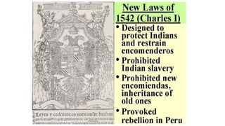Spanish conquistadors like Hernan Cortes and Francisco Pizarro led expeditions in the early 1500s that conquered the Aztec and Inca empires and established Spain's control over Mexico and Peru. European diseases devastated indigenous populations. The Spanish established three main settlement types: presidios (forts), missions (religious communities), and pueblos (towns). A social hierarchy developed with Spanish-born elites at the top and Native Americans and African slaves facing exploitation, slavery, and oppression at the bottom.