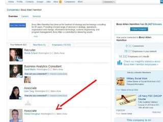 This document provides tips for using social networking to enhance a cleared job search. It recommends connecting with recruiters, companies, and former colleagues on LinkedIn, following target companies and recruiters on Twitter, and maintaining an online presence through social media profiles. The key activities highlighted are researching companies online, joining relevant groups, getting endorsements and recommendations, and networking to expand your reach and opportunities. Maintaining an online brand and controlling your online reputation is also emphasized.