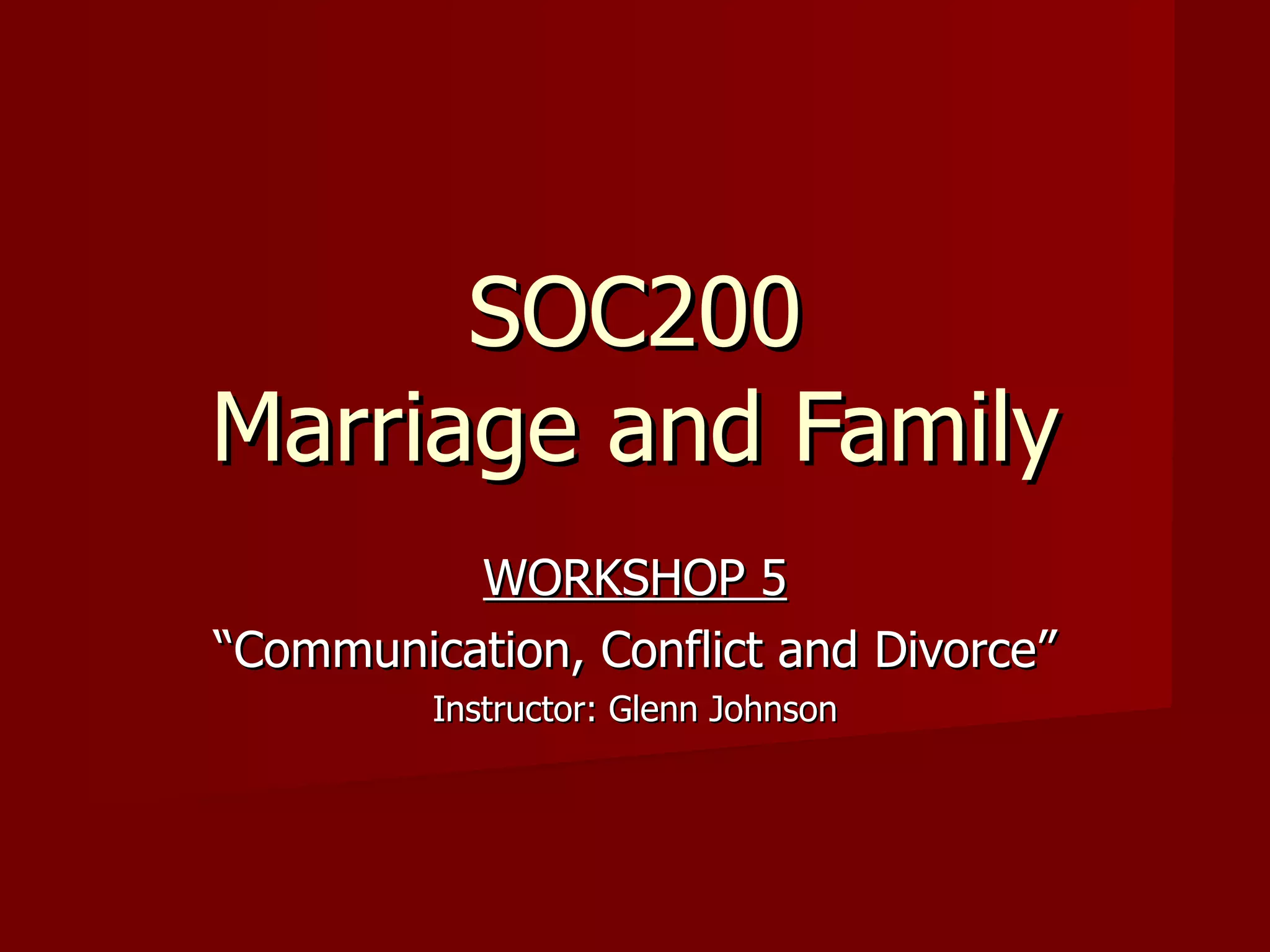 This document summarizes a workshop on communication, conflict, and divorce. The workshop covers healthy communication patterns in families, sources of conflict in marriage, styles of conflict behavior, and strategies for resolving conflicts. It also discusses the negative effects of divorce based on a long-term study, including impacts on children's development, education, and relationships. The workshop provides advice on preventing divorce and principles for building strong, healthy relationships.