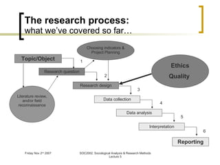 This document discusses data collection methods for sociological research, focusing on surveys and questionnaires. It explains that the choice of data collection method depends on the research question, objectives, and advantages/disadvantages of different techniques. Surveys and questionnaires are described as a common way to collect quantitative data. Key aspects of survey design discussed include question structure, layout, question wording, and delivery methods.