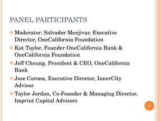 The document discusses a panel on socially responsible collaboration and banking your values. It introduces the panel participants from organizations like OneCalifornia Bank, OneCalifornia Foundation, Inner City Advisors, and Imprint Capital Advisors. The panel discusses OneCalifornia Bank's innovative social business model and examples of collaborations between organizations to provide economic development, financial literacy, and impact investing that leverages capital for social goals.