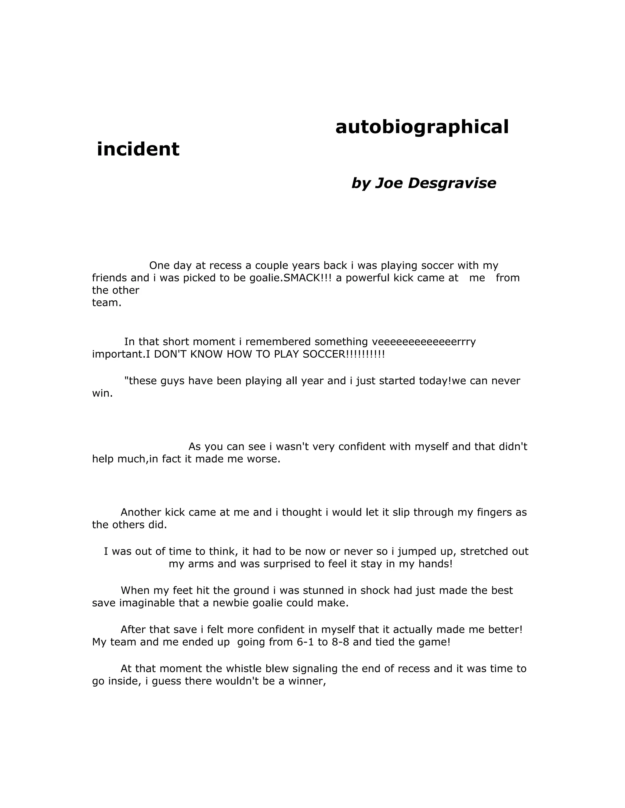 autobiographical incident by Joe Desgravise One day at recess a couple years back i was playing soccer with my friends and i was picked to be goalie.SMACK!!! a powerful kick came at me from the other team. In that short moment i remembered something veeeeeeeeeeeeerrry important.I DON'T KNOW HOW TO PLAY SOCCER!!!!!!!!!! "these guys have been playing all year and i just started today!we can never win. As you can see i wasn't very confident with myself and that didn't help much,in fact it made me worse. Another kick came at me and i thought i would let it slip through my fingers as the others did. I was out of time to think, it had to be now or never so i jumped up, stretched out my arms and was surprised to feel it stay in my hands! When my feet hit the ground i was stunned in shock had just made the best save imaginable that a newbie goalie could make. After that save i felt more confident in myself that it actually made me better! My team and me ended up going from 6-1 to 8-8 and tied the game! At that moment the whistle blew signaling the end of recess and it was time to go inside, i guess there wouldn't be a winner,