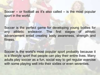 Soccer is the most popular sport in the world and is a great activity for kids to develop physically and socially. It is easy to learn, provides excellent exercise, and can be enjoyed from childhood through older ages. Soccer develops agility, speed, stamina and teamwork while also being a fun social activity. Soccer Time Kids is a soccer program for ages 1-5 that teaches basic skills in a fun, educational environment while also promoting fitness, social skills and cognitive development.