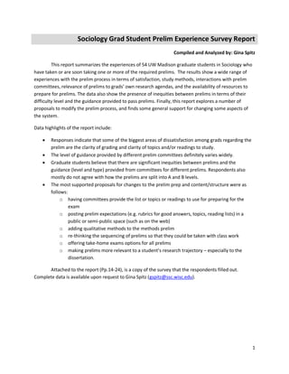 The document summarizes the results of a survey of 54 sociology graduate students at UW Madison about their experiences with prelim exams. Key findings include: students reported dissatisfaction with unclear grading and exam topics/readings; guidance from committees varied widely; and students felt there were inequities between exams in difficulty and committee support. Students mostly agreed prelims were relevant to their research but did not agree with the current A/B exam structure. Proposed changes that received support included committees providing reading lists and publicly posting exam expectations.