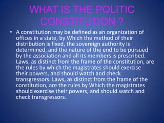 - Constitution: The organization of offices in a state that determines sovereign authority and the goals of the association. Laws are rules for how magistrates exercise power.