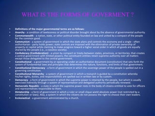 - Forms of government: Includes definitions of terms like anarchy, commonwealth, communism, confederacy, constitutional democracy, constitutional monarchy, democracy, dictatorship, federal republic, monarchy, oligarchy, parliamentary democracy, republic, socialism, sultanate, theocracy, and totalitarian.