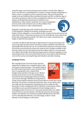 Henry Buckham was contracted to design promotional materials for the charity Surfers Against Sewage, including a logo, campaign poster, recruitment form, and merchandise. He created several logo designs before settling on a simple circular logo featuring a wave shape. For the campaign poster, he designed two versions before selecting one with a serious message about cigarette litter using impactful typography and color matching the logo. The recruitment form featured images of polluted beaches with compelling text to recruit members. The merchandise line included apparel and accessories branded with original graphics tying into SAS campaigns.