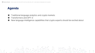 The document discusses the application of social analytics and natural language understanding in the cryptocurrency market, highlighting the limitations of traditional sentiment analysis and topic extraction methods. It emphasizes the transformative impact of transformer models like GPT-3 in enhancing language intelligence capabilities relevant to crypto analytics, such as news summarization, classification, and question-answering. The summary also notes that while these advanced techniques hold great potential, they are still costly and require domain-specific training.
