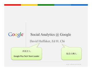This document summarizes two studies conducted by Google on social annotations in web search. The first study found that only 11% of users noticed social annotations in search results. A second study tested different designs and found that annotations received more attention when placed above search snippets and with shorter snippets. The studies concluded that users prioritize URLs, titles, and snippets in search results, and annotations must compete for attention based on placement, length of surrounding text, and size of avatar icons.