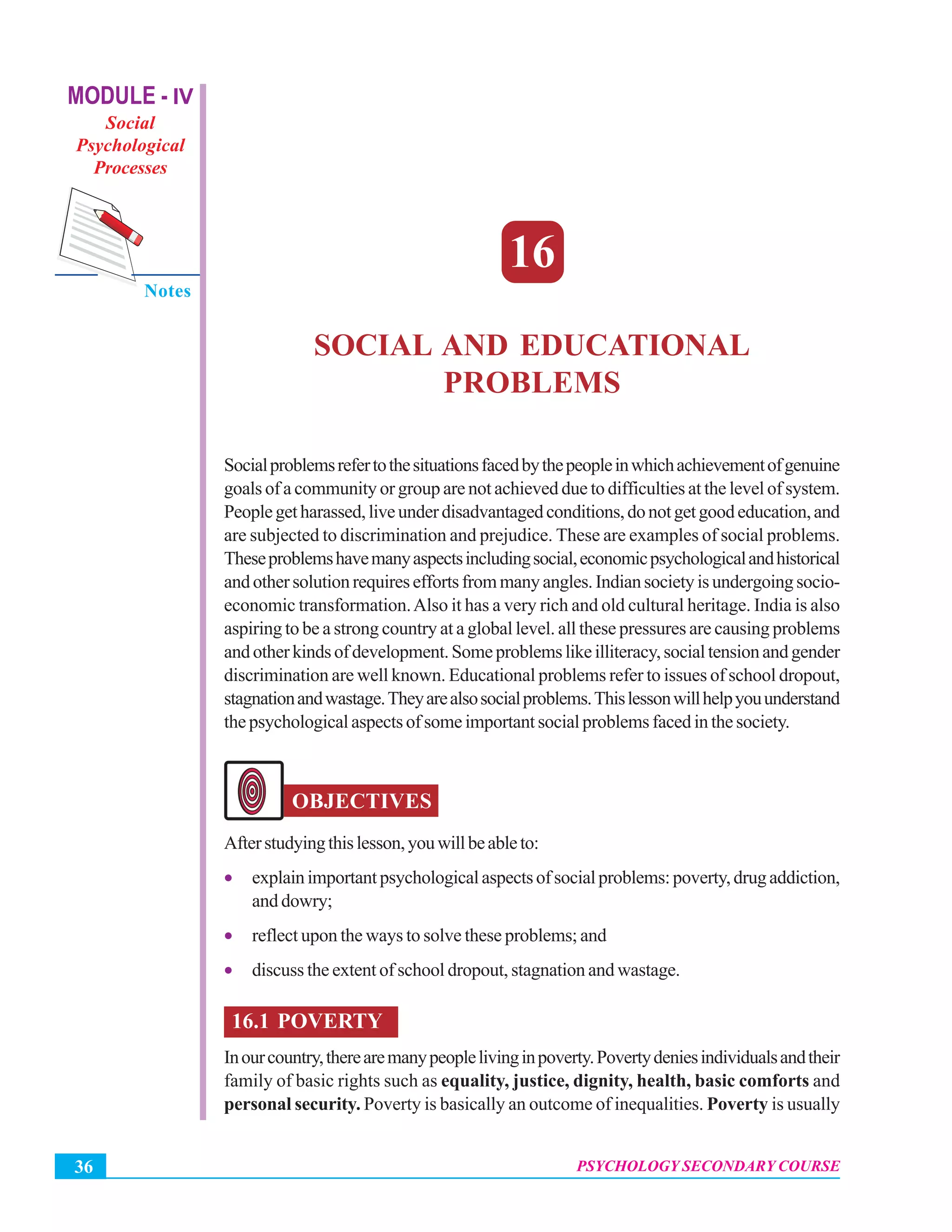 The document then focuses on analyzing the psychological aspects of some key social problems - poverty, drug addiction, and dowry. It explains the causes and consequences of poverty, like malnutrition, poor socialization patterns, effects on personality development and mental health. For drug addiction, it discusses risk factors like peer pressure, genetics, and maturity. It notes dowry was originally to help with marriage expenses but now burdens families.