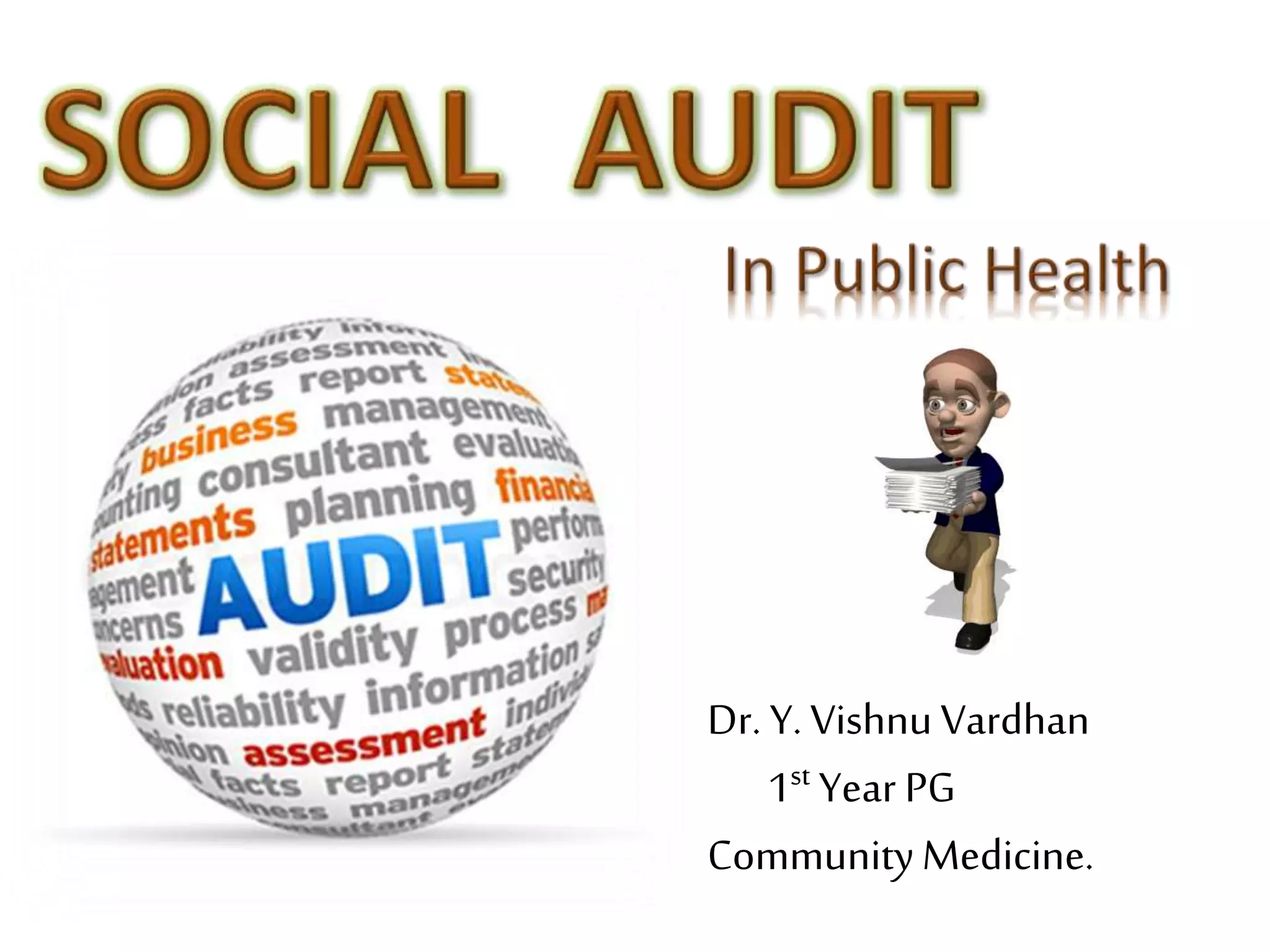Dr. Y. Vishnu Vardhan discusses social audits, which involve stakeholders in planning, monitoring, and evaluating projects and programs to ensure effective implementation and control irregularities. Social audits complement financial audits by assessing outcomes over outputs. The basic principles of social audits are transparency, participation, accountability, comparability, verification, and disclosure. Social audits are conducted over the lifespan of a project or program. The methodology involves 6 steps: defining boundaries, identifying stakeholders, data collection, verifying findings, public meetings, and institutionalizing social audits. An example social audit of a mid-day meal scheme in schools is provided. Social audits are recognized as an important tool to improve program performance monitoring and