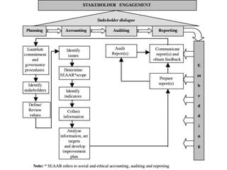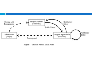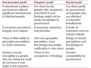 Social auditing involves regularly assessing an organization's social and environmental performance based on indicators agreed upon with stakeholders. It aims to evaluate impact on stakeholders, determine how well the organization lives up to its values, and improve strategic planning and accountability. The process involves defining objectives, identifying stakeholders, collecting and verifying data, analyzing and interpreting results, and disclosing findings publicly. Social audits empower communities and increase transparency and accountability in development programs.