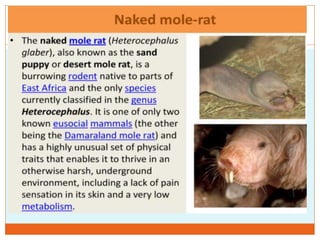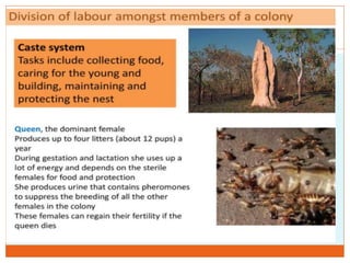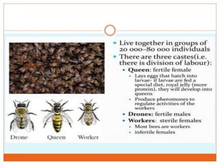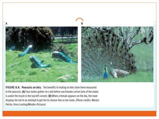 This document discusses social behavior and mating systems in animals. It defines social behavior as interactions between two or more animals of the same species that affect one another. Animals form social groups for benefits like protection, cooperative hunting, and care of young. Mating systems include monogamy where one male and female pair up; polygamy where one sex has multiple mates; and promiscuity where both sexes mate with multiple partners. Different mating strategies evolve depending on ecological and social factors.